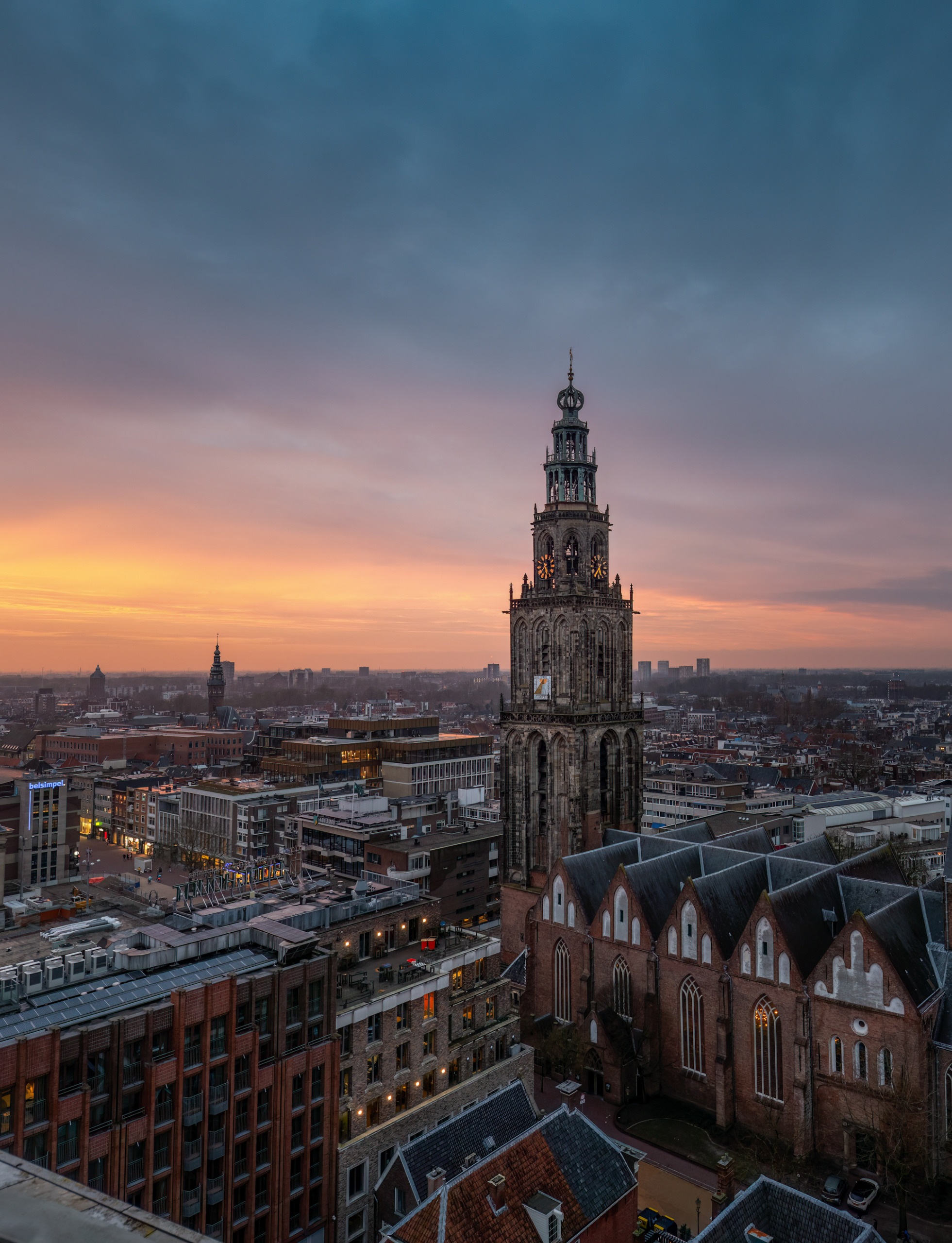 Tim vertelt: ‘De Martinitoren, trots en tijdloos, torent hoog boven het hart van Groningen uit. Op deze foto, genomen vanaf het Forum — hét moderne culturele centrum van de stad — ontmoeten verleden en toekomst elkaar. Het Forum zelf symboliseert innovatie, nieuwsgierigheid en verbinding. Vanaf het dak kijk je niet alleen uit over de stad, maar ook over de lagen geschiedenis die Groningen vormen. De combinatie van gotische architectuur en moderne stedelijke ontwikkeling maakt deze plek uniek. Het uitzicht biedt niet alleen een panorama, maar een gevoel van perspectief. Het is een plek die uitnodigt tot verwondering, reflectie en trots op de stad.’ Volg Tim op Instagram.