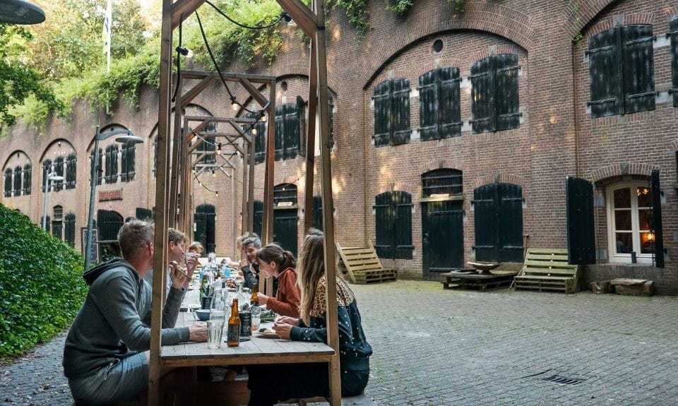 Zo ziet dineren op de binnenplaats bij Kool Geit Wolf eruit, met op de achtergrond het fort van Abcoude.