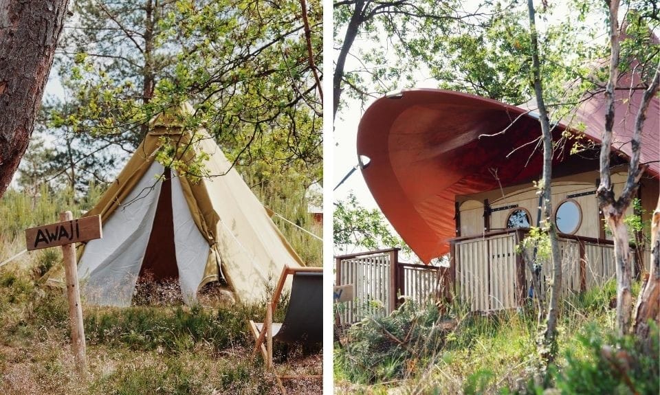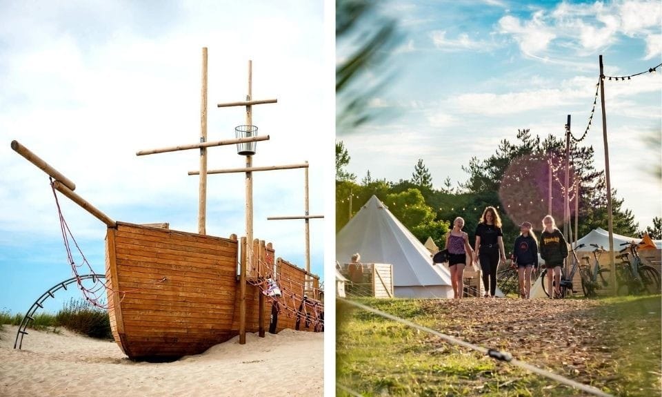 Links: het speelschip. Rechts: moeder loopt met de kinders over het glampingterrein van Laguna Beach.