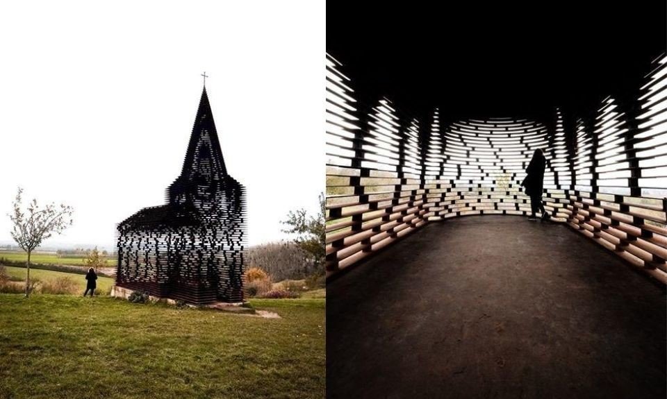 Het doorkijkkerkje 'Reading between the Lines' staat bovenop de Haspengouwse heuvels. Foto: Simone Wittgen