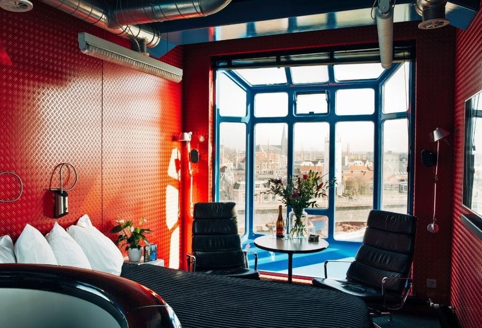 Het is al bijzonder dat je comfortabel kunt overnachten in een oude havenkraan. Maar je kunt óók nog eens zelf je uitzicht bepalen! Door middel van een stuurknuppel zet je 65.000 kilo staal in beweging en draai je rond en rond. Aan de ene kant kijk je uit op het knusse centrum van Harlingen en aan de andere kant op de Waddenzee. Een overnachting start bij € 319 per nacht voor twee personen incl. ontbijt.