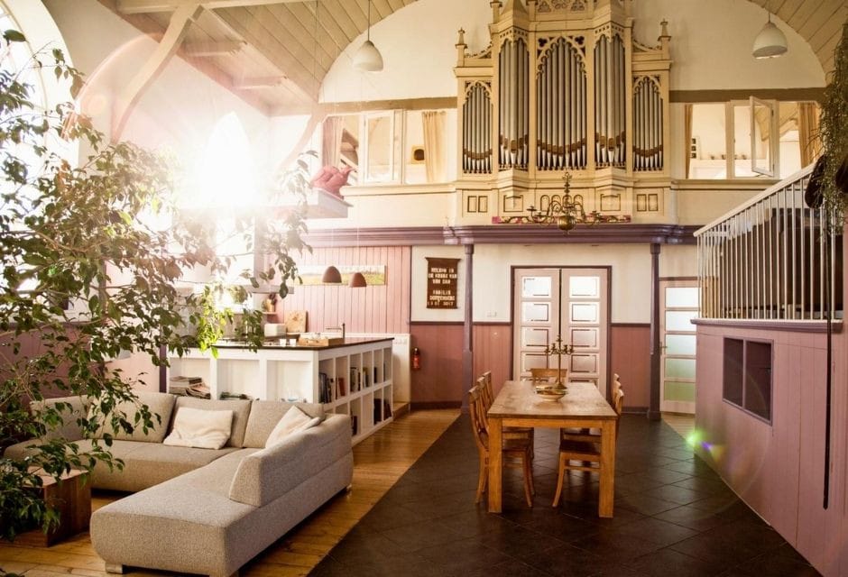 Ooit bood de dorpskerk in het Friese Oosterbierum plaats aan 160 gasten en een pastoor. Maar nu maken jij en je reisgenoten er de (kerk)dienst uit. De Kraak van Van Dam is getransformeerd tot een sfeervolle groepsaccommodatie. In de kerkzaal vind je naast een ouderwetse preekstoel en een orgel, óók een keuken en meerdere zithoeken. De slaap- en badkamers bevinden zich aan de voor- en bovenkant. Achterom staan fietsen klaar. Honderd keer trappen en je staat aan de Waddenzee, duizend keer trappen en je staat in het centrum van Franeker, vanaf € 750 voor een midweek en € 1025 voor een weekend voor acht personen (€ 55 per extra persoon).