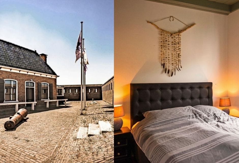 Fort Kijkduin, in de Noord-Hollandse kustplaats Huisduinen, dateert uit 1811 en is onderdeel van de Stelling Den Helder, een verdedigingslinie die werd aangelegd op bevel van Napoleon. Het fort ligt ter hoogte van Paal 0, het punt waar de Noordzee overloopt in de Waddenzee en de strandpalentelling begint, en huist een museum en Noordzeeaquarium. Fort Kijkduin voelt enigszins toeristisch aan, tenzij je blijft slapen in het oude fortwachtershuisje op het voorplein. Als de menigte huiswaarts keert en de poorten dichtgaan, heb jij het rijk voor jou alleen. Wandel door de droge gracht, beklim de toren en geniet van het uitzicht op zee. Het huisje is fraai ingericht en heeft authentieke details, vanaf € 144 per nacht voor twee personen (incl. museum- en aquariumbezoek).