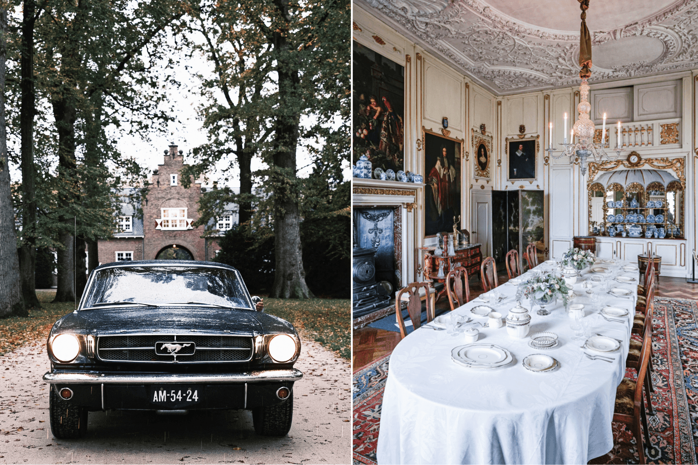 Wil je echt in stijl bij de kastelen en landhuizen van de Utrechtse Heuvelrug arriveren? Huur dan een oldtimer bij We Love Oldtimers. Wij kozen een elegante, donkerblauwe Ford Mustang Coupé uit 1966, maar je kunt ook gaan voor een Volkswagen-busje of Kever of een klassieke Porsche.