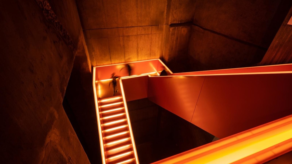 Kolen werden vroeger door tunnels en over lopende banden over het terrein van Zollverein vervoerd. De zwarte tunnel — compleet met feloranje roltrap — is de hoofdingang naar het Ruhr Museum.