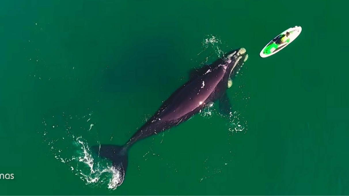 In Nederland kun je prima over grachten en kanalen suppen zonder dat er onder je gevaar schuilt. In Argentinië ligt dat nét even anders. Daar kwam deze peddelsurfer letterlijk in aanraking met een andere waterbewoner, die blijkbaar maar al te graag even 'hoi' kwam zeggen. Gelukkig lijkt hij weinig kwaads in de zin te hebben … Walvissen worden niet voor niets 'gentle giants' genoemd!