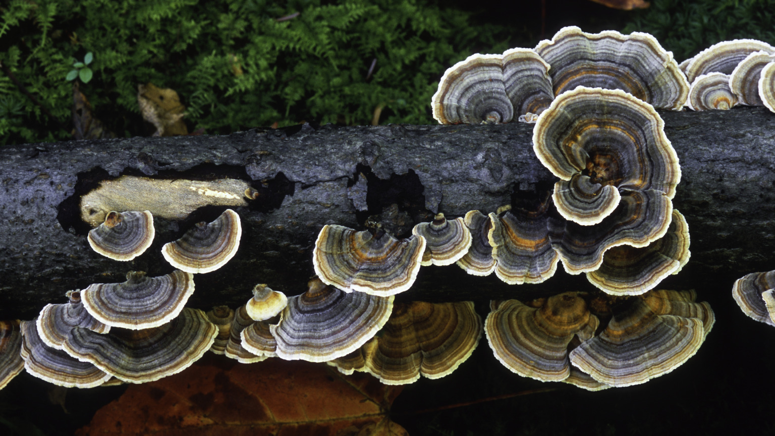 - Gewoon elfenbankje (Trametes versicolor): veelvoorkomende paddenstoel met gestapelde, waaiervormige lagen in verschillende tinten van bruin tot wit, en groeit op dode of verzwakte bomen.