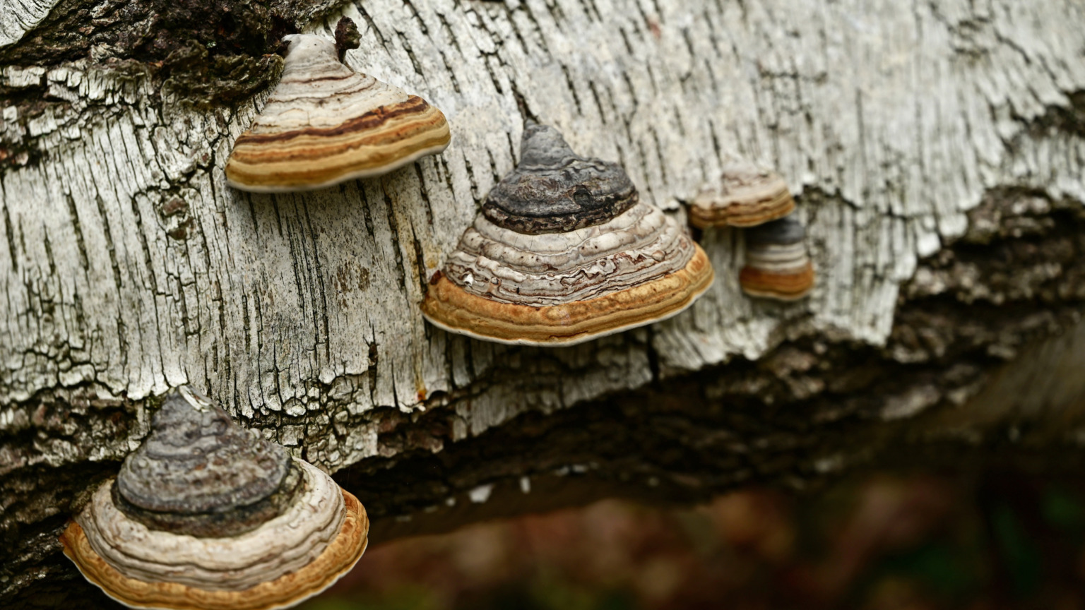 - Echte tonderzwam (Fomes fomentarius): houtachtige, hoefvormige paddenstoel die vaak groeit op dode of verzwakte bomen, met een grijze tot bruine kleur en duidelijke jaarringen.