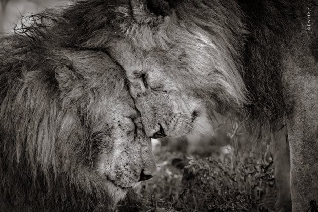 Twee volwassen mannetjes, waarschijnlijk broers, wrijven dertig seconden lang met de neuzen tegen elkaar. Het is voor leeuwen helemaal niet gebruikelijk om zo lang te snuffelen, maar David was erbij én legde het vast. De prijswinnaar over zijn foto: 'Gevoelens en emoties zijn niet alleen toegeschreven aan mensen. Voor het welzijn van alle dieren is het belangrijk dat mensen daar meer bewust van worden. Daarom ben ik zo blij dat mijn foto goed is ontvangen.'