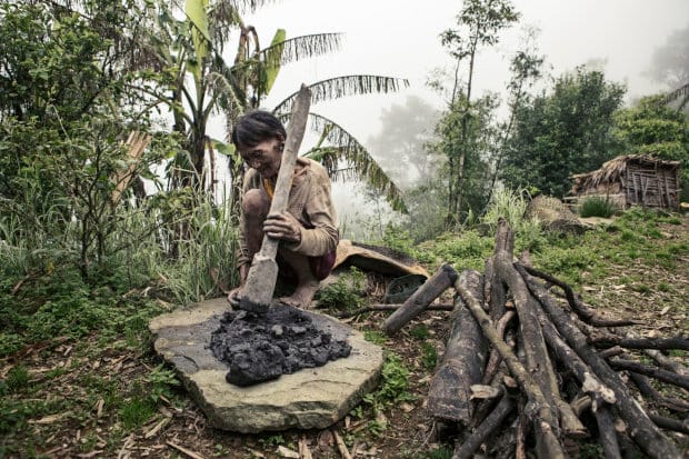 Een Konyak vrouw stampt op klei om er potten van te maken (Foto: Peter Bos)