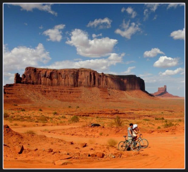 Reisreporter Hans de Wildt spotte deze fietsers door Monument Valley