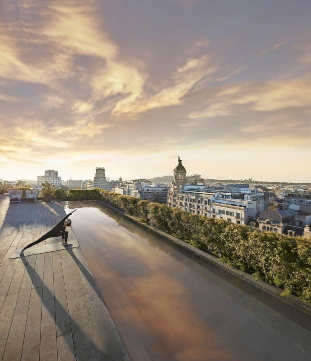 Doe je yoga-oefeningen in alle rust bij het zwembad van vijfsterrenhotel Mandarin Oriental, pal aan de Passeig de Gràcia. (Foto: Mandarin Oriental Group)