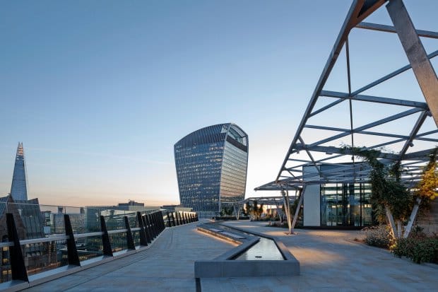 Je hoeft de wolken niet te krabben voor een waanzinnig uitzicht, zo bewijst The Garden at 120 in het centrum van Londen. Dit nieuwe dakpark ligt ingeklemd tussen ‘The Gerkin’ (30 St Mary Axe) en ‘The Walkie-Talkie’ (20 Fenchurch Street), en biedt uitzicht op Canary Wharf en The Shard. The Garden at 120 zelf – de Engelsen hebben er nog geen troetelnaam voor bedacht – ligt op de zestiende verdieping van One Fen Court, het hoofdkwartier van een Italiaanse verzekeringsmaatschappij, en is te bereiken via een lift. Het dakpark wordt gekenmerkt door een stalen frame waar planten tegenaan groeien, bloemperken en een watergoot, en voldoende zitplekken om van je zelf meegenomen lunch te genieten. Gratis toegang, first come, first served.