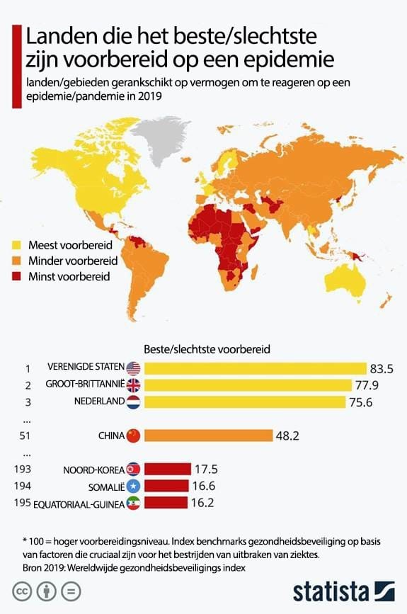 Het is opmerkelijk dat Zuid-Amerika en Afrika het Corona-virus tot nu toe bespaard zijn gebleven. Gelukkig maar, want veel landen in Afrika zijn slecht voorbereid op een eventuele uitbraak, waar Zuid-Amerika er ook niet klaar voor is. In Europa is het virus inmiddels ook doorgedrongen, maar – samen met Noord-Amerika – kunnen wij het virus buitengewoon goed opvangen. Nederland staat derde op de lijst met landen die het best zijn voorbereid, nipt achter de Verenigde Staten en Groot-Brittannië.