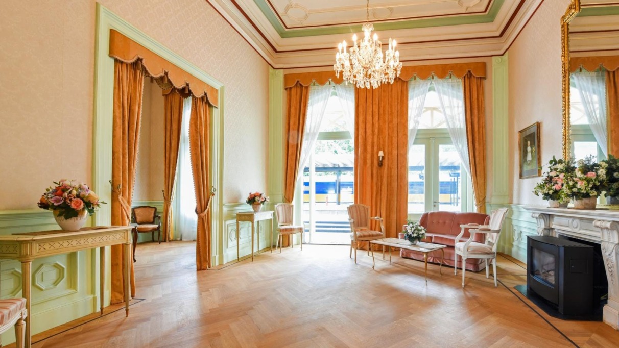 ‘Koningen wachten niet,’ vertelt Loek terwijl we door de fraai versierde deur de wachtkamer binnenlopen. ‘Zij zitten hier met hun gegadigden te kletsen en pas wanneer de trein voorrijdt, kijken ze op.’ We stappen de royaal ingerichte salon binnen. Kroonluchters verlichten de ruimte terwijl de regen zachtjes op het dak tikt. In mijn gedachten zie ik de koninklijke familie al op de rode fauteuil uit een wit porseleinen kopje nippen. De geel-blauwe NS-trein die door de ramen te zien is, valt een beetje uit de toon tussen de mintgroene en zalmroze kleuren van de wachtkamer. Ik probeer me in te beelden hoe anders dat moet zijn geweest toen vroeger de stoomtrein voorreed.