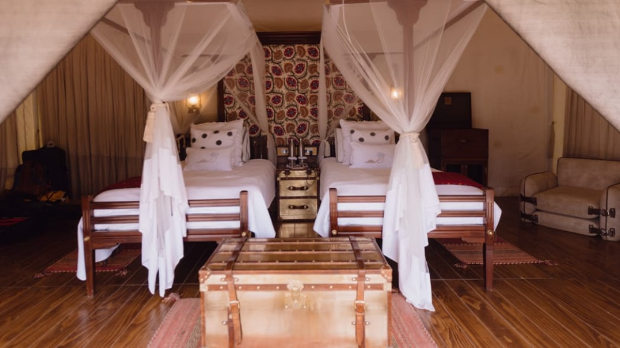 Tijdens onze reis door Ladakh, bezochten we twee campsites die worden gerund door The Ultimate Traveling Camp. Hun canvastenten zijn geproduceerd in Kenia. Chamba Camp Thikse telt twintig tenten en ligt op een prachtige locatie aan de voet van het Thikseklooster. Een aantal van de tenten heeft een terrasdek met uitzicht op het klooster. Chamba Camp Diskit ligt in een van de meest dramatische en surrealistische landschappen ter wereld: de Nubravallei. Het kamp wordt verlicht door middel van zonne-energie. Op het terrasdek aan het water geniet je van misschien wel de beste boterkip van India. Vanaf € 775 (Thikse) en € 825 (Diskit) per nacht voor twee personen (incl. maaltijden, excursies en transfers).