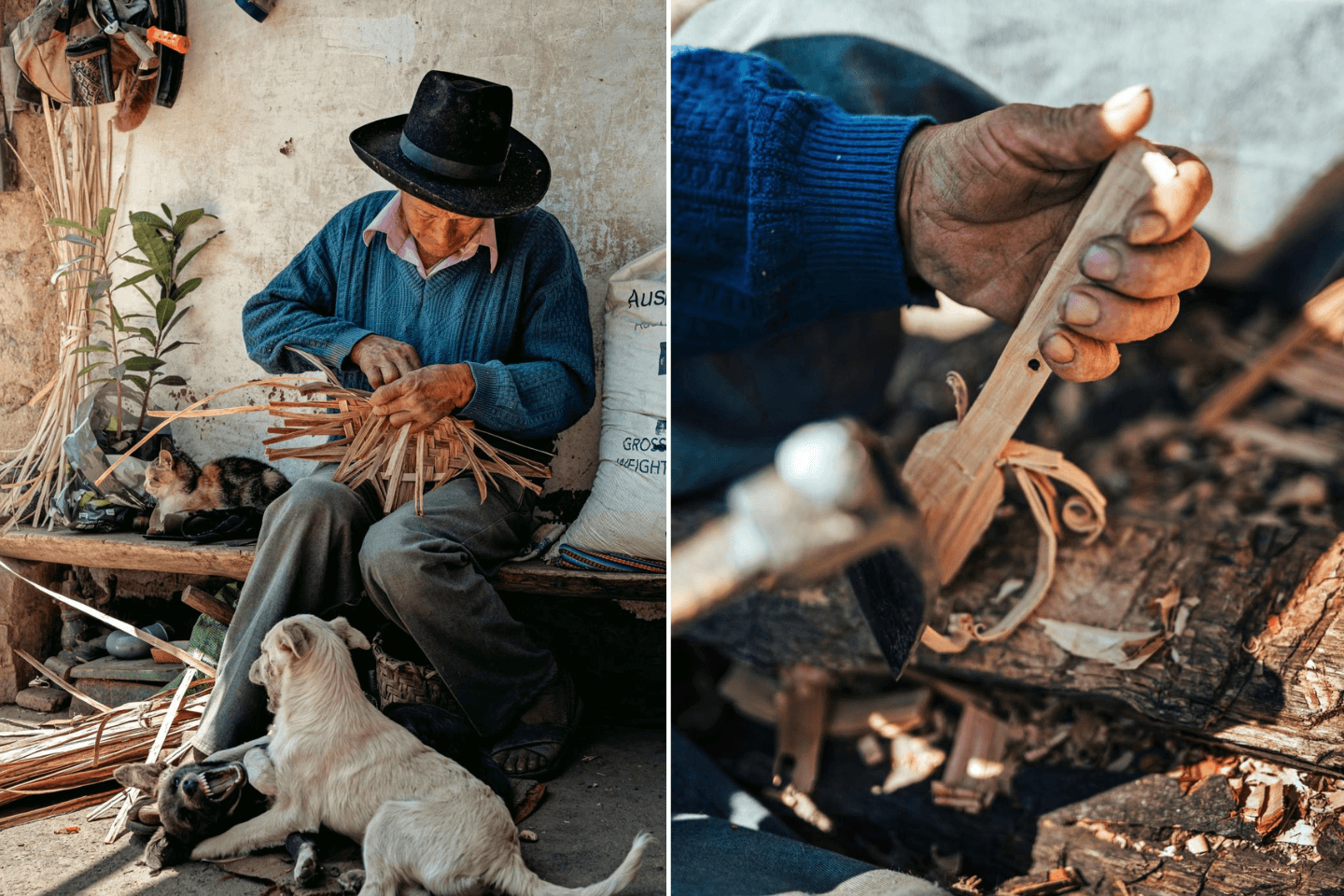 ‘Turismo vivencial betekent tijdelijk deel uitmaken van de familie’, legt Pablo uit.’Wij beschouwen onze gasten als familie. We zorgen voor hen en hebben vertrouwen in ze.’ Manuel Apeña, een lokale ambachtsman uit Vicos, geeft een demonstratie mandenvlechten en hoe je lepels van hout maakt.