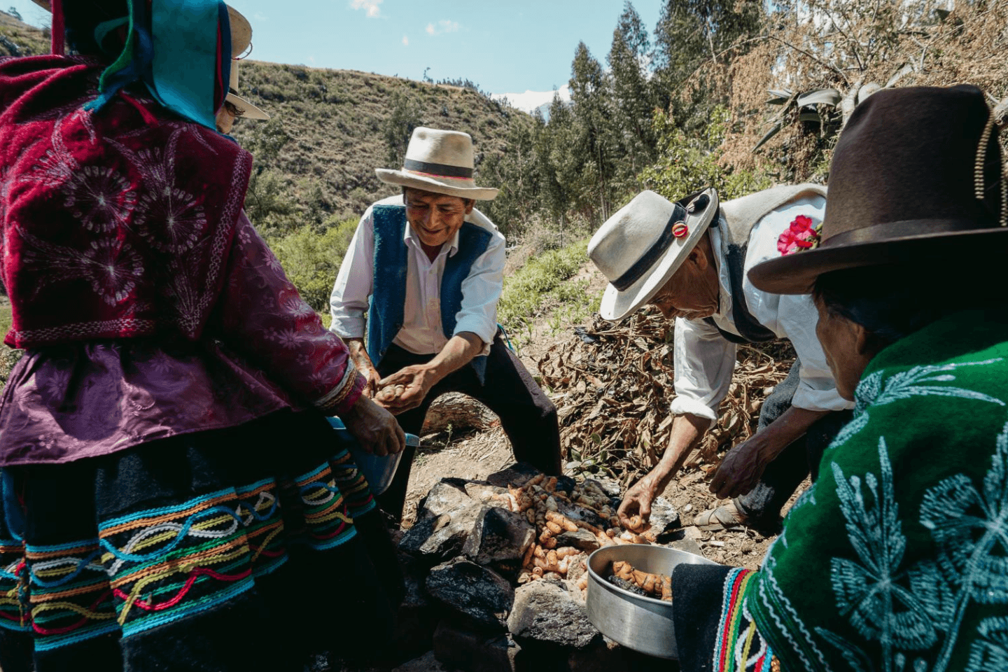 Wanneer we ontwaken van een koude nacht onder zware wollen dekens − Vicos ligt op ruim drieduizend meter hoogte, en de enige verwarming is het houtvuur in de keuken − is Pablo al bezig met het bouwen van een pachamanca, een ‘pan van aarde’, waarin vlees, groenten en aardappelen worden gegaard op gloeiendhete stenen onder de grond. De pachamanca is méér dan een gerecht. Het is een duizenden jaren oud ritueel waaraan de hele gemeenschap meehelpt en deelneemt.