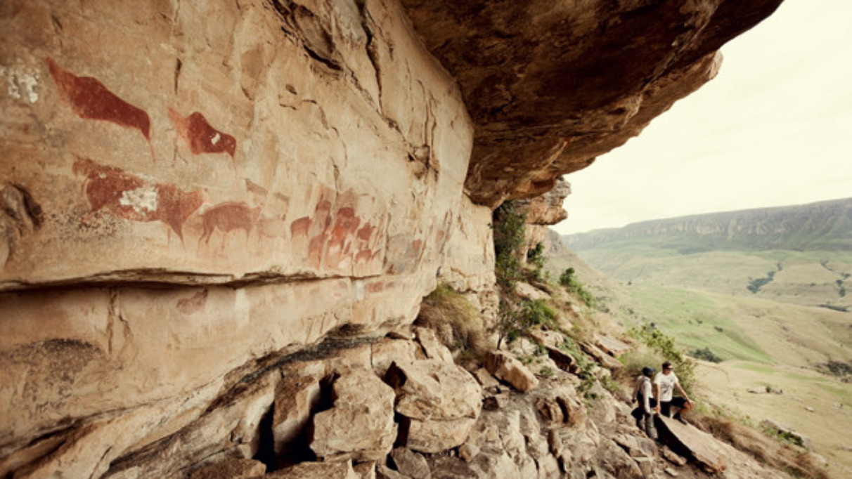 Vele kilometers hebben we gelopen en nog altijd zijn we niemand tegengekomen. Om ons heen verheffen zich bergen van vulkanisch gesteente en zandsteen, afwisselend bleek, zwart of bedekt met groen. Ze ogen tijdloos, bevroren, dreigend. Nomen est omen: het huis van draken. In het in 1916 gestichte Royal Natal National Park, gelegen in het noorden van de Zuid-Afrikaanse Drakensbergen, kijk je diep in de geschiedenis van het continent. 150 miljoen jaar geleden scheurde de aarde er open en hoestte een ondenkbare hoeveelheid lava op. Het magma stolde en vormde een keten van grillige pieken. Een van de bekendste is het Amphitheatre. De zwarte muur, bron van ’s werelds op één na hoogste waterval, vormt een natuurlijke barrière tussen de provincie KwaZulu-Natal en het bergkoninkrijkje Lesotho. De wand beklimmen zal ons niet gegeven zijn – onze plek is aan zijn voeten. Terwijl voor ons wolkenpartijen over de rand van het Amphitheatre tuimelen, baadt achter ons het landschap in fel zonlicht. Dat is typisch voor de ‘Berg’, zegt gids Mduduzi.