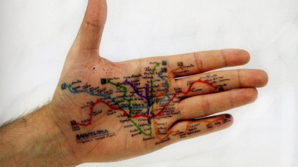 Deze nuttige tatoeage is ontworpen door de Spaanse ontwerper Martí Guixé. Hij kijkt hoe het metronetwerk van een bepaalde stad in elkaar zit en maakt hier zijn eigen ‘tatoeageontwerp’ van. Deze kan dan door een tatoeëerder op de binnenkant van je hand getatoeëerd worden.