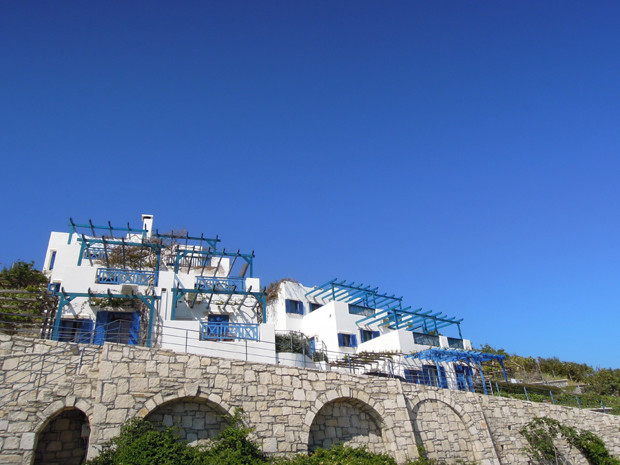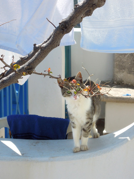 Na een soepele vlucht, stappen we in de huurauto en rijden van Heraklion langs de kust naar het Westen. Richting Agia Pelagia en dan off-road omhoog, slinger slinger, en nog wat steiler omhoog. Naar de mooie wit-blauwe appartementen, waar eigenaresse Peppy, samen met een stuk of zes katten, op ons wacht. We krijgen een sfeervol appartement met groot terras op de begane grond. Er staat een kruidig bosje bloemen, een koud Grieks wijntje en wat fruit voor ons klaar. De vakantie kan beginnen! Wat een fantastisch uitzicht over de dorpjes beneden, de kleine baaitjes en natuurlijk de mooie blauwe Middellandse zee. En die dikke wolken? Die zijn volgens de voorspellingen morgen weg.