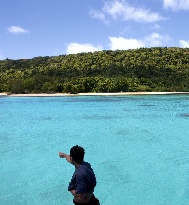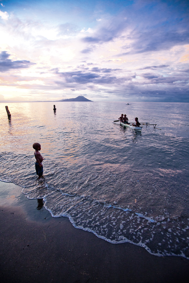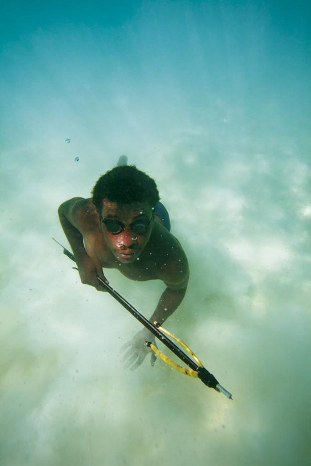 De wateren rondom Papoea Nieuw Guinea kennen de grootste biodiversiteit ter wereld. Je kunt er zwemmen met zeeschildpadden, duiken met haaien én snorkelen met speervissers. Deze verlegen jongen kwam ik tegen in de zee rondom New Ireland, bij de riffen van de Tsoi-eilanden, maar hij ging er snel vandoor (dit was buiten het gebaande pad, dan nog verder van het gebaande pad en dan nóg verder van het gebaande pad). Misschien maakte mijn enorme onderwaterhuis té veel indruk op hem. De Tsoi-eilanden liggen als een halve ring rondom het grote eiland New Hanover. Tot aan de horizon zie je hier een aaneenschakeling van de kleuren blauw en groen.