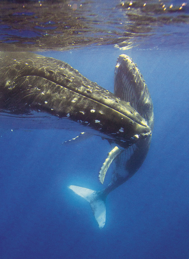We hebben een moeder met haar net geboren jong gevonden. In slakkengang pruttelt de boot nog iets dichterbij, de enorme donkere vlek in het water wordt steeds groter. De gids gaat het water in en bekijkt of de situatie veilig is. We mogen het water in. Voor me verschijnt een dier dat zo groot is dat er meerdere olifanten in zouden passen. Tegen haar aangeplakt het pasgeboren kalf, dat nu al zo’n vijf meter lang is. De blik van de moeder lijkt door de naar beneden gekromde bek een beetje treurig, alsof ze moet denken aan het leed dat haar soortgenoten in de afgelopen eeuwen is aangedaan. Want dat leed is niet te overzien. Al in de achttiende eeuw begon de jacht op bultruggen. Met name moeder en kalf waren een gemakkelijke prooi. Had je het kalf eenmaal geharpoeneerd en vastgesjord aan het schip, dan kwam de moeder vanzelf naar haar inmiddels dode jong toe en kon zo gemakkelijk ook worden gedood. Op het dieptepunt van de walvissenjacht, midden jaren tachtig van de vorige eeuw, bedroeg de grootste subpopulatie bultruggen slechts zestig vrouwtjes. In 1986 werd eindelijk de jacht op walvissen wereldwijd verboden, in Tonga legde koning Tupou de Vierde deze al acht jaar eerder aan banden. Net op tijd voor de walvissen en de Tonganen. Volwassen bultruggen komen namelijk net als zwaluwen en zalmen elk jaar terug naar de plek waar ze geboren zijn om te paren en te baren. Heb je je eigen wateren leeg geharpoeneerd, dan zie je nooit meer een walvis. Zo is in de eens zo walvisrijke wateren rond Fiji al tientallen jaren geen walvis meer te zien. Maar dit kalf is hier voorlopig veilig. Tonga heeft nauwelijks inkomsten en is vooral aangewezen op het toerisme. Terwijl mama rustig aan de oppervlakte dobbert, kronkelt het jong om haar heen en komt nieuwsgierig naar me toe. Ik schrik hier zo van dat ik vergeet de knop van mijn onderwatercamera in te drukken. Het jong kijkt me met haar oog ter grootte van een tennisbal aan. Ze volgt me nauwgezet terwijl ze op slechts een meter afstand langs me heen zwemt. Ik had de verhalen al gelezen van andere walviszwemmers, voor wie dit een van de mooiste ervaringen van hun leven was, en ik geef ze geen ongelijk. Na dit oogcontact worden de rollen omgedraaid. Tot nu toe was het niet zo zeer zwemmen met walvissen als wel dobberen met walvissen, maar mama heeft besloten om onze kant op te komen. Zonder enige zichtbare moeite komt het kolossale dier dichterbij. Samen met de andere zwemmers probeer ik netjes uit de zwemrichting van deze Megaptera novaeangliae te blijven. Kansloos natuurlijk. Het duurt haar te lang. Ze besluit enkele meters te duiken en onder ons door te glijden om aan de andere kant weer roerloos te blijven liggen. Zes maanden al heeft ze niet gegeten. De hele tocht van de Antarctische wateren tot haar verblijf hier drieduizend kilometer verderop heeft ze niets gegeten, terend op de dikke laag blubbervet die haar lichaam zo enorm maakt en zo gewild voor allerlei producten, van cosmetica tot medicijnen. Pas als ze in oktober terug is in de Antarctische Oceaan zal ze zich tegoed kunnen doen aan de enorme hoeveelheden krill (een soort plankton) en kleine visjes in het water.
