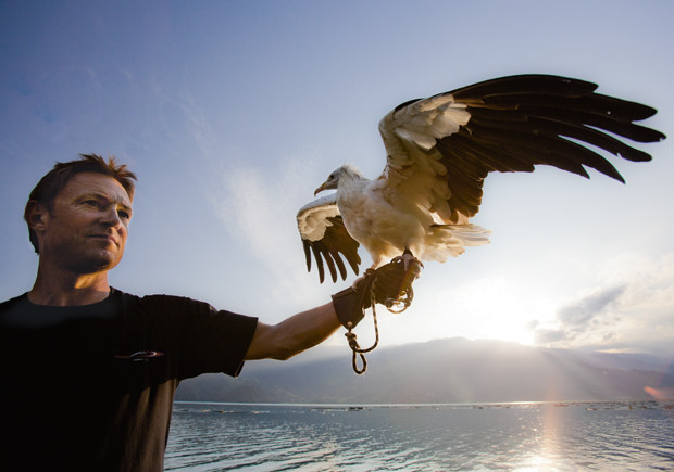 Scott Mason, een Britse valkenier, probeert al jaren het tij te keren. We ontmoetten hem in zijn uitvalsbasis Pokhara, zo’n 140 kilometer ten noordwesten van Kathmandu. Scott vangt de zieke beesten op en traint sommigen voor parahawking: paragliden met haviken of, in dit geval, gieren. De vogels zoeken instinctief warme luchtstromen, ook wel thermiekbellen genoemd, op om hoogte te winnen en vormen dus de perfecte metgezel. Van november tot april is Scott regelmatig boven het meer van Pokhara te zien met zijn parachute en twee gieren of haviken aan weerszijden – een fenomenaal gezicht. Jij kunt met Scott meevliegen tijdens een zogeheten tandemsprong (€ 100). ‘Bij de start zit de vogel nog op je hand, maar al snel vliegt hij op korte afstand mee’, legt Scott uit. ‘Hij blijft bij je tot het eind, als je de daling van een halve kilometer inzet.’
