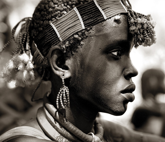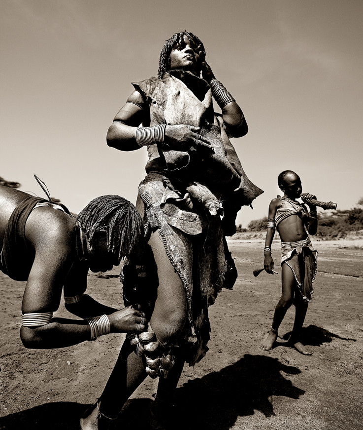 Deze vrouw zag ik tijdens het Jumping the bull festival in Ethiopië (bij het dorpje Turmi in het zuidelijke puntje van Ethiopië). De ruggen van de vrouwen zaten vol met striemen, terwijl het bloed over hun met rode oker ingesmeerde lijfen en geitenhuiden rokken gutste. Het is niets dan gewoon voor deze vrouwen van het Hamervolk. Ze willen niets liever dan geslagen worden om in de gunst van vrijgezel Dolo te komen. Wie ben ik dan om te uit te schreeuwen dat de vrouwen gek zijn om zich zo te laten slaan, daar zullen ze zich zelf bewust van moeten worden. Maar ik kon af en toe mij tranen niet bedwingen door de pijn die ik voelde.