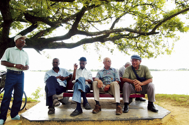 Paramaribo aan de waterkant. Deze heren brengen elkaar op de hoogte van het laatste nieuws, lekker in de schaduw van een boom. Om de mannen goed te belichten is onder de boom de belichting bepaald. Door het grote contrast raakt de achtergrond overbelicht. Ik hou daarvan. Sommige fotografen zouden inflitsen om meer detail in de achtergrond te krijgen en het contrast tussen de mannen en de achtergrond kleiner te maken.