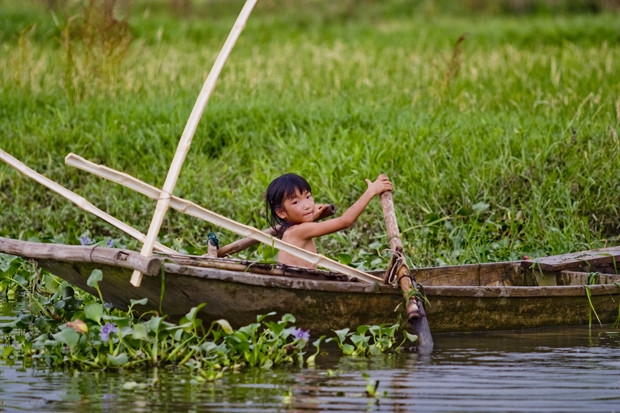 Bijna tien jaar geleden maakte ik deze foto die onderdeel zou gaan uitmaken van een grote reportage over het noorden van Vietnam. We kwamen een jongen tegen die ons attendeerde op floating villages, gemeenschappen die nagenoeg het hele jaar door op het water verblijven en het vaste land zelden zien, of het moest voor hele dringende zaken zijn. Van de voetroeiers hadden we al gehoord en je vraagt je af wie dat verzonnen zou hebben! Zelf eens iets bestuurd met je tenen, behalve een gaspedaal? In ieder geval fotografeerde ik dit mooie meisje redelijk stiekem met mijn telelens. Nog even aandacht vragen en klik. Omdat ze niet met haar voeten roeide haalde de foto de publicatie niet.