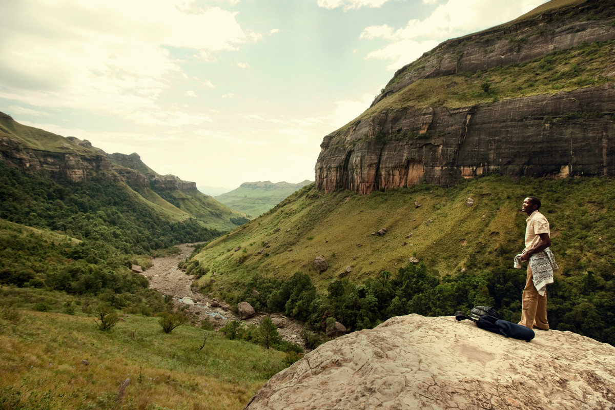 Vele kilometers hebben we gelopen en nog altijd zijn we niemand tegengekomen. Om ons heen verheffen zich bergen van vulkanisch gesteente en zandsteen, afwisselend bleek, zwart of bedekt met groen. Ze ogen tijdloos, bevroren, dreigend. Nomen est omen: het huis van draken. In het in 1916 gestichte Royal Natal National Park, gelegen in het noorden van de Zuid-Afrikaanse Drakensberg-regio, kijk je diep in de geschiedenis van het continent. 150 miljoen jaar geleden scheurde de aarde er open en hoestte een ondenkbare hoeveelheid lava op. Het magma stolde en vormde een keten van grillige pieken. Een van de bekendste is het Amphitheatre. De zwarte muur, bron van ’s werelds op één na hoogste waterval, vormt een natuurlijke barrière tussen de provincie KwaZulu-Natal en het bergkoninkrijkje Lesotho. De wand beklimmen zal ons niet gegeven zijn – onze plek is aan zijn voeten. Terwijl voor ons wolkenpartijen over de rand van het Amphitheatre tuimelen, baadt achter ons het landschap in fel zonlicht. Dat is typisch voor de ‘Berg’, zegt gids Mduduzi. Mduduzi was al jong door dit landschap gegrepen, geïnspireerd door de grootmoeder die hem opvoedde. Voor haar stond alles in het teken van de Zoeloecultuur, die nauw verweven is met de natuur. Ernstig: ‘Ik wilde óók het juiste doen, op de juiste manier leven.’ Het betekent onder meer dat hij kromligt om zijn toekomstige schoonfamilie elf koeien te kunnen overhandigen – voorwaarde om de moeder van zijn kinderen te mogen huwen. Één dier kost al gauw 7000 rand, zo’n 700 euro, voor de gemiddelde Zoeloe een vermogen. ‘Maar de traditie is belangrijk. Het geven van vee helpt de families te binden.’