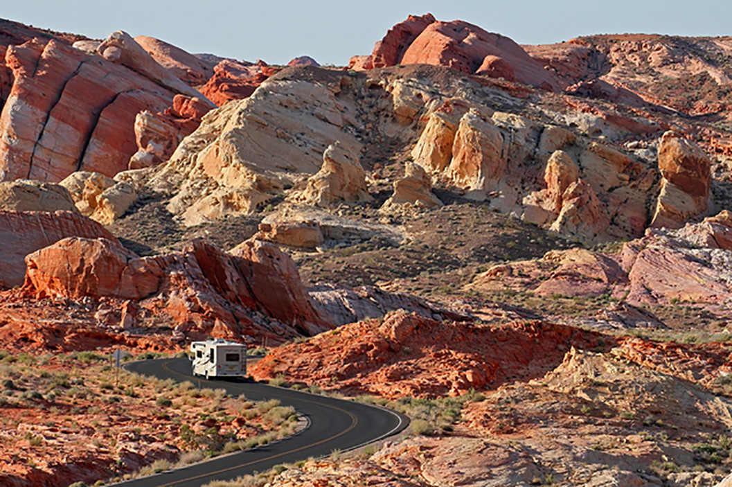 Toeren door de Valley of Fire S.P., een klein maar prachtig kleurrijk staatspark. Het park staat vooral bekend om zijn kleurrijke rotsen die door wind- en watererosie de meest prachtige vormen hebben gekregen. (Foto: Columbus Reisreporter antwan)