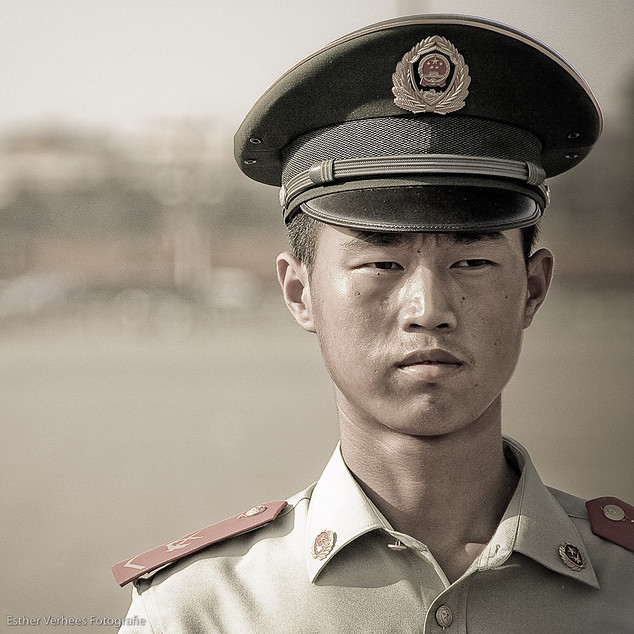 Een Chinese politieagent houdt alles nauwlettend in de gaten (Foto: Columbus Reisreporter esther)