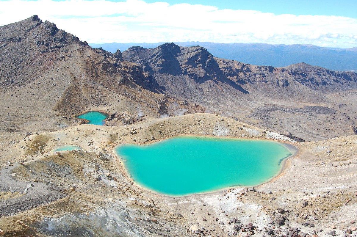 In Tongariro National Park in Nieuw-Zeeland heb je een twaalf kilometer lange wandelroute: de Tongariro Alpine Crossing. Deze hike leidt je langs de Emerald Lakes, drie indrukwekkende groene meren. Ze komen aan deze kleur door de opgeloste vulkanische mineralen, afkomstig van het landschap dat vrijwel helemaal bestaat uit vulkanisch terrein.