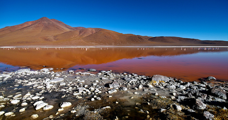 Bolivia’s Laguna Colorada, ook wel de Red Lagoon genoemd, dankt zijn kleur aan de afzetting van een algensoort die in het meer leeft. Deze algen zijn bovendien een goede voedingsbron voor flamingo’s. Die kom je hier dan ook in grote getalen tegen.