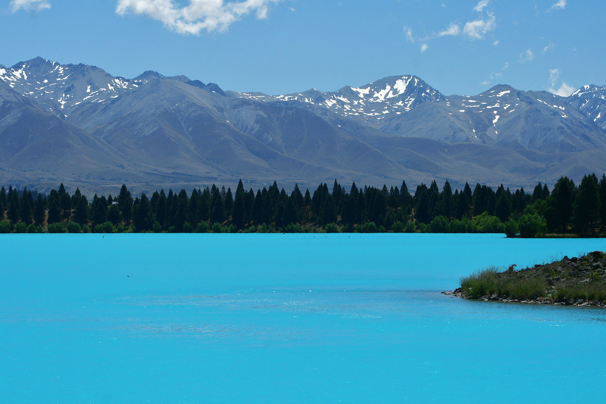 Nog een mooie in Nieuw-Zeeland: Lake Pukaki. Dit meer is wel 53 kilometer lang, en als het zonnetje erop schijnt, word je getrakteerd op een onnatuurlijke, bijna neppe blauwe kleur. Toch is het er écht! De fijngemalen rotsdeeltjes zorgen voor de kleur.