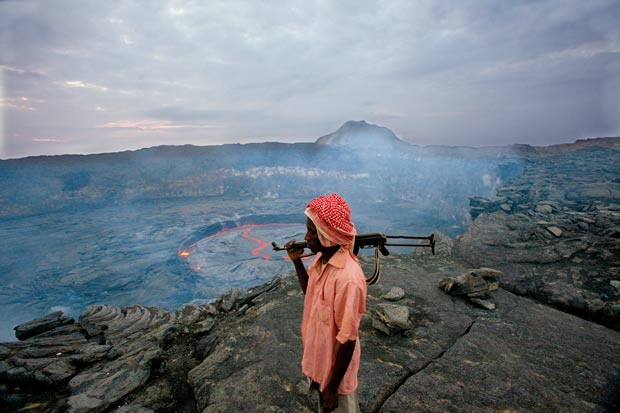 Erta Ale is de actiefste vulkaan van Ethiopië en een van de slechts vier vulkanen ter wereld met een lavameer op de top dat het hele jaar door pruttelt en lava spuugt. In 2010 trokken adjunct-hoofdredacteur Mark en ik ernaartoe. Een echte expeditie die een gedegen voorbereiding vergde. Je trekt een paar dagen dwars door het bloedhete land van de bijzondere Afar-stam om bij de voet van de vulkaan te komen. Daarna volgt een hike van een halve dag, met een kameel die campingspullen en matrasjes draagt. Eenmaal boven sta je direct aan de kraterrand. In Europa zou zoiets niet mogelijk zijn en zou er ver van de kraterrand een groot hek staan. Hier niet. Wij waren de enige bezoeker. In de openlucht sliepen we ongeveer tien meter van de kraterrand, met de gloed van het lavameer als verlichting. Nou ja, van slapen kwam weinig terecht…