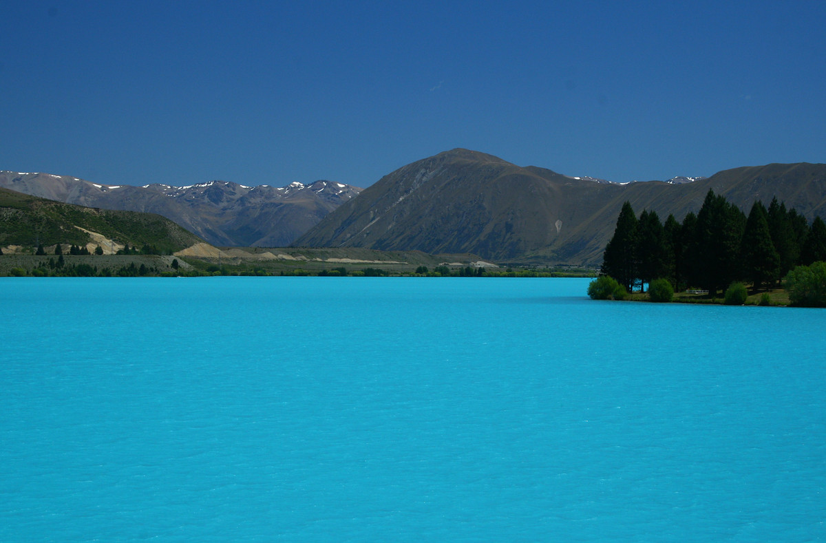 Het 53 kilometer lange Lake Pukaki op het Zuidereiland doet vanwege de onwerkelijke kleur haast nep aan. Zeker als de zon erop schijnt. Toch is het geen optische illusie. Het water dank haar kleur aan fijngemalen rotsdeeltjes.