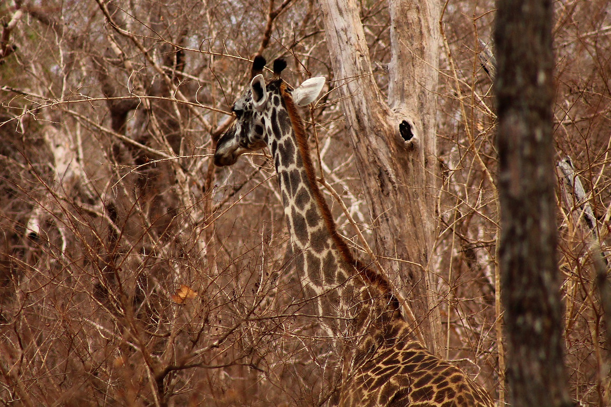 We beginnen met een gemakkelijke. Je zou deze giraffe in een dor Tanzaniaans bos haast niet herkennen.