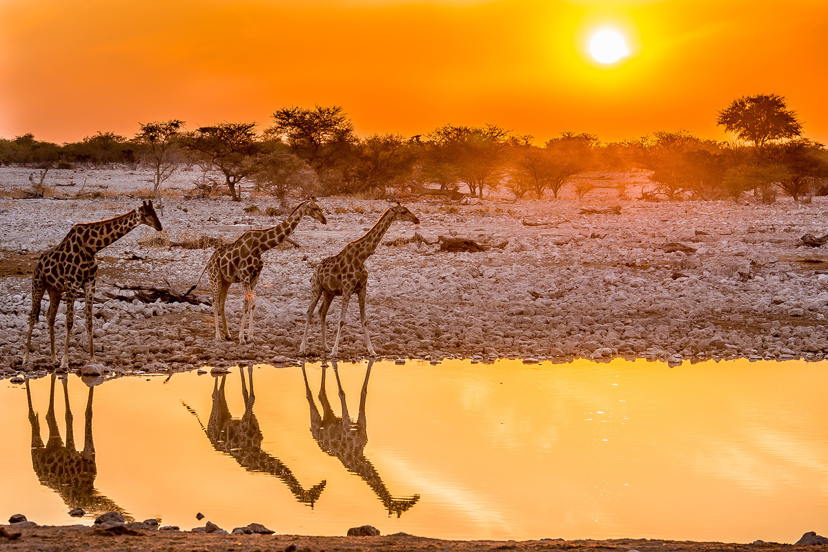Rond zonsondergang verzamelen giraffen zich rond een van de waterpoelen (Foto: Reisreporter erictkindt)