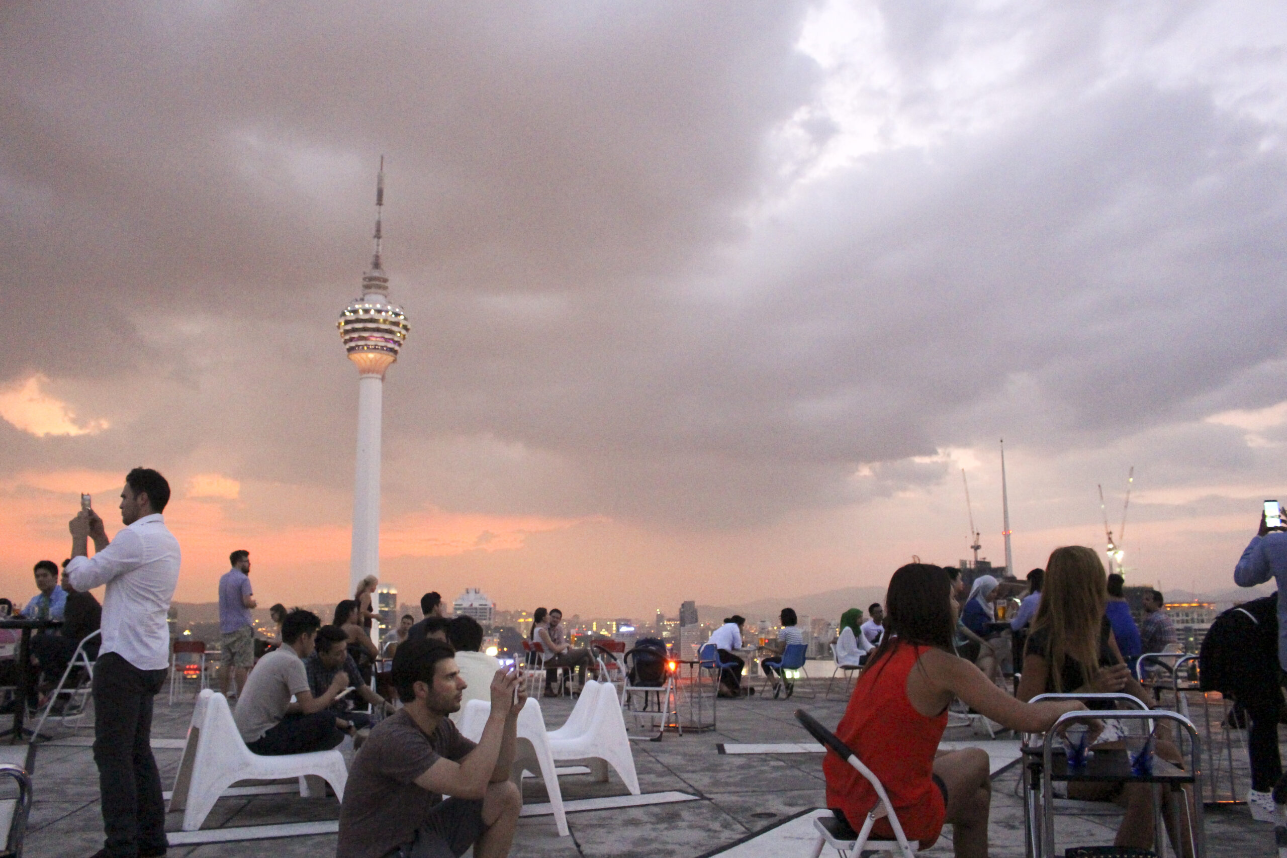 Zodra er even geen helikopterlandingen plaatsvinden op de 34e verdieping van Menara KH verandert dit helikopterplatform in een van de coolste rooftopbars van de wereld.