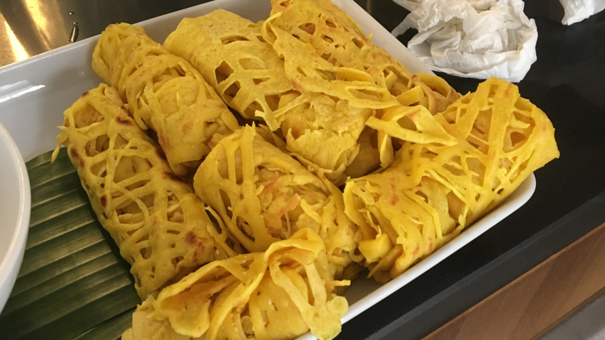 Zeef het meel en de kurkuma in een grote kom en voeg zout toe. Breng het geklopte ei, het water en de kokosmelk samen en voeg toe aan de droge ingrediënten. Roer tot een glad beslag. Zeef nogmaals. Verhit olie in een pan, giet het beslag in een knijpfles en breng het in kleine ronde sliertjes aan in de pan. Laat bakken tot de bovenkant doorzichtig uitziet. Dit duurt ongeveer twee minuten. Keer om en laat de andere kant nog een minuutje bakken. Laat de pannenkoek op een bord glijden, vouw beide kanten naar binnen en rol hem op tot een opgerold net.