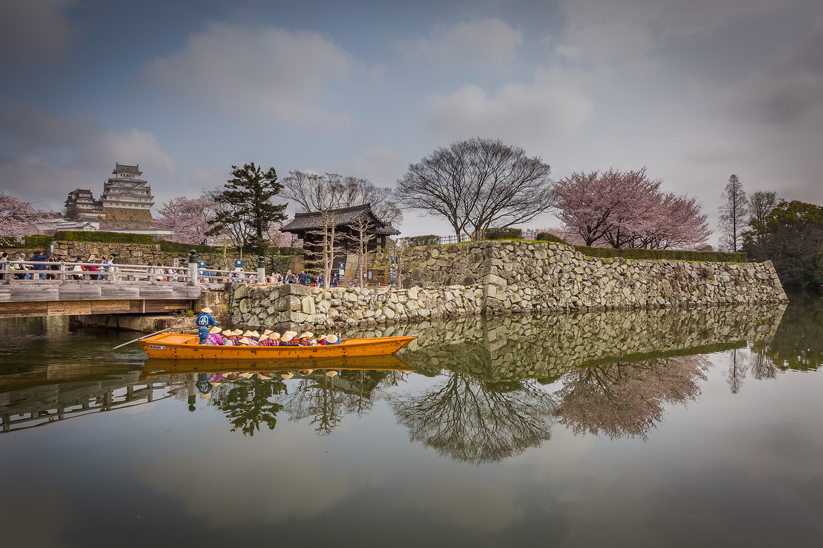 Juryoordeel: ‘Leuk dat in deze foto het bekende kasteel van Himeji op de achtergrond figureert en dat er ook aandacht is voor de in Japan zo belangrijke kersenbloesem. De weerkaatsing in het water met het bootje met kleurrijke passagiers maakt het plaatje compleet.’