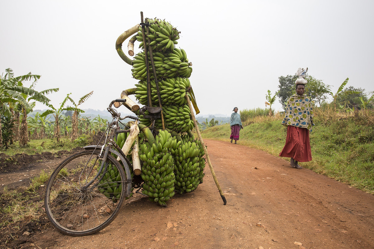 Hier afgebeeld: een stapel matoke, een groene bananensoort uit Oeganda (Foto: Reisreporter antwan)
