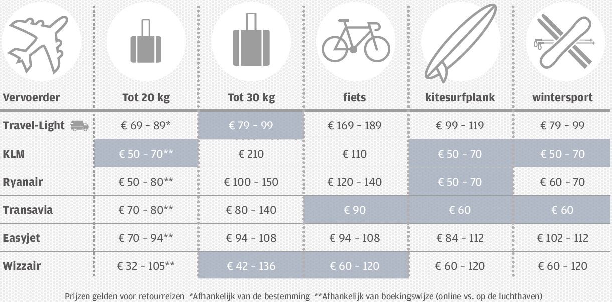 Wat zijn nou eigenlijk de kosten die gemoeid zijn met grote bagagestukken? En wat zijn de prijsverschillen tussen de verschillende airlines? We hebben naar de grote luchtvaartmaatschappijen en de nieuwe bagageservice Travel-Light gekeken. De goedkoopste opties zijn hieronder gearceerd.