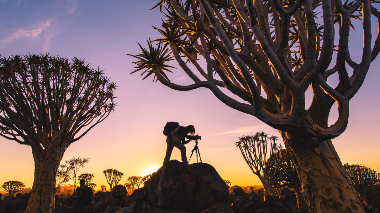 Reisfotograaf met statief legt een landschap vast bij zonsondergang