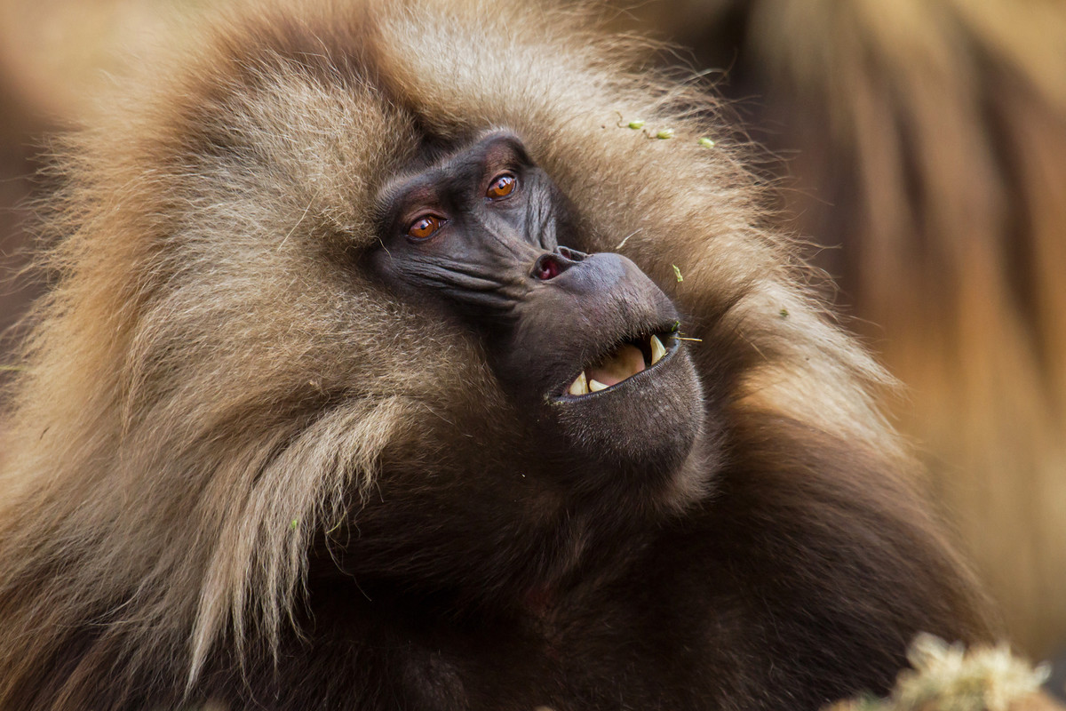 De Gelada baviaan wordt ook wel de Rode Hart baviaan genoemd. Vooral de mannetjes zijn imponerend met hun grote tanden en prachtige manen (Foto: Columbus Reisreporter hbplaatjes)