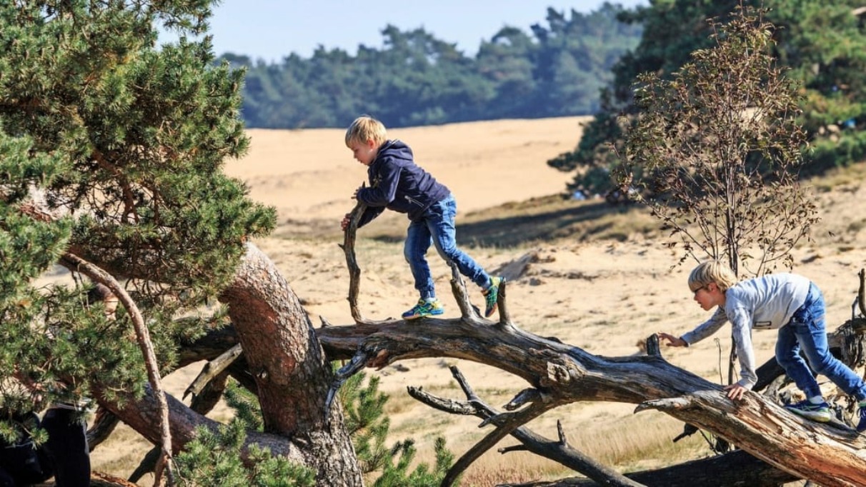In bomen klimmen, zwemmen in meren, leren windsurfen of een rondje over de heide fietsen — de ongerepte landschappen van de Veluwe zijn een geweldige plek voor kinderen om in de wilde natuur te kunnen spelen. Wist je dat een natuurlijke omgeving kinderen meer uitdaagt tot onderzoek en creativiteit? Dat geldt overigens ook voor volwassenen — buitenspelen is gezond voor iedereen. Bovendien liggen de leukste attracties van Nederland op steenworp afstand van de Veluwe. Loop bijvoorbeeld langs slingerende apen bij Apenheul en door woeste savannes in Burgers’ Zoo. Kastelen, zwembaden, klimbossen en speeltuinen vind je hier eveneens in overvloed.