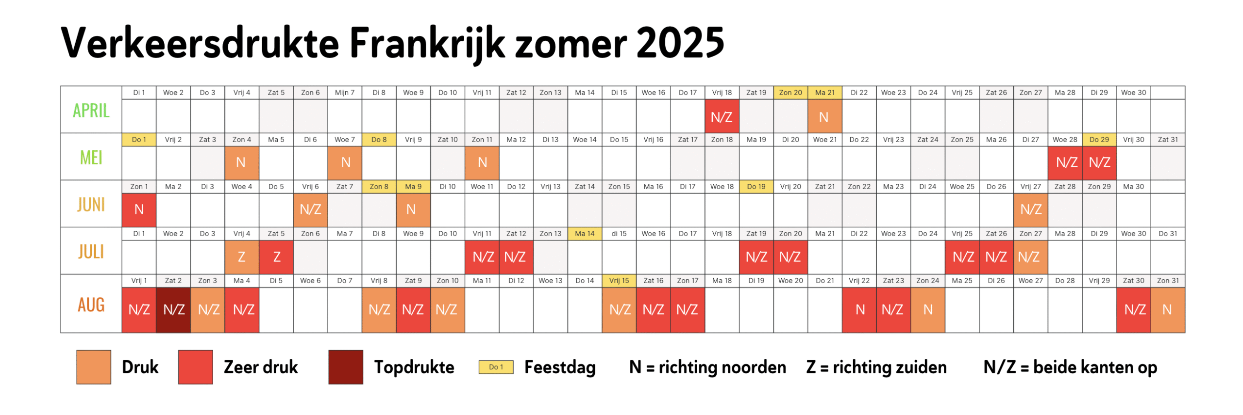 Vermijd de A6, A7 (Route du Soleil), A9 en A10 richting de Middellandse Zee, evenals de Périphérique van Parijs. Ook de A40/A43 naar Italië (Fréjus- en Mont Blanctunnel) en de A40 richting Zwitserland (Bardonnex/Geneve) zijn berucht. Wens je tóch in deze periode te rijden, kies dan bij voorkeur een donderdag of zondag. De Tour de France (5 t/m 27 juli 2025) kan lokaal extra opstoppingen veroorzaken.